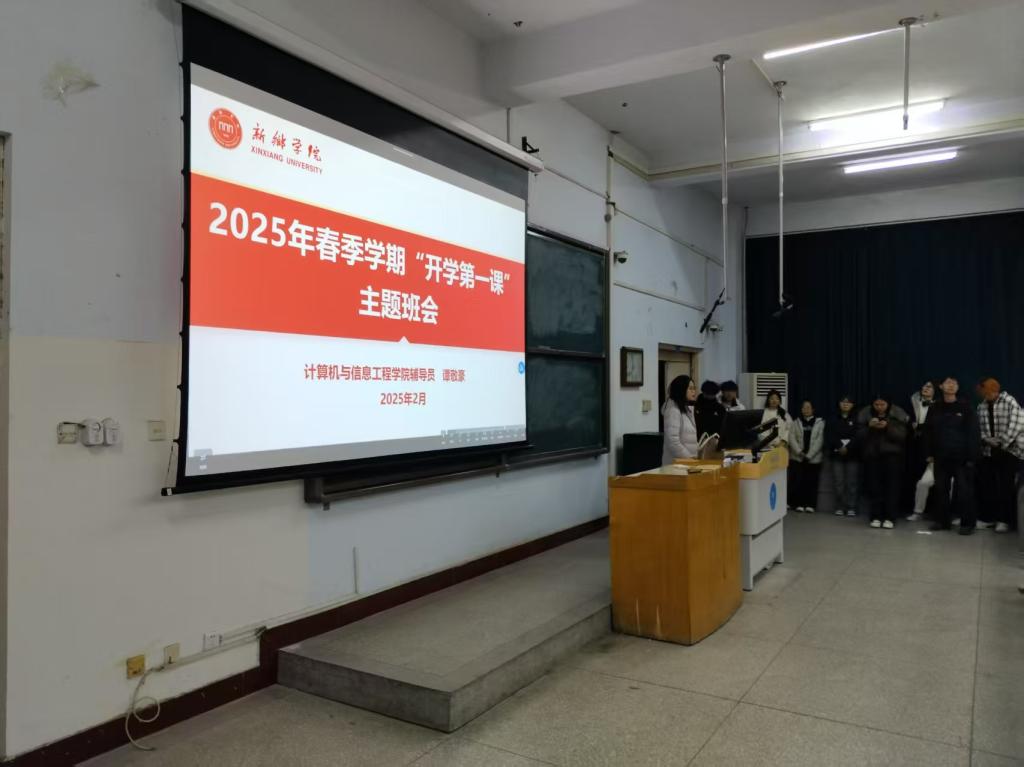 为了引导员工以饱满的热情投入新学期,进一步加强纪律严明的学风建设,提高同学们的安全意识。2月18日晚19:00,2024级计算机类2班、3班、4班和2024级人工智能1班在A01-119教室举行了以“开学第一课”为主题的班会活动。此次活动深受同学们重视,不仅体现在四个班共300余人无一缺席与迟到,还体现在300多双眼睛自始至终汇聚于讲台中心。