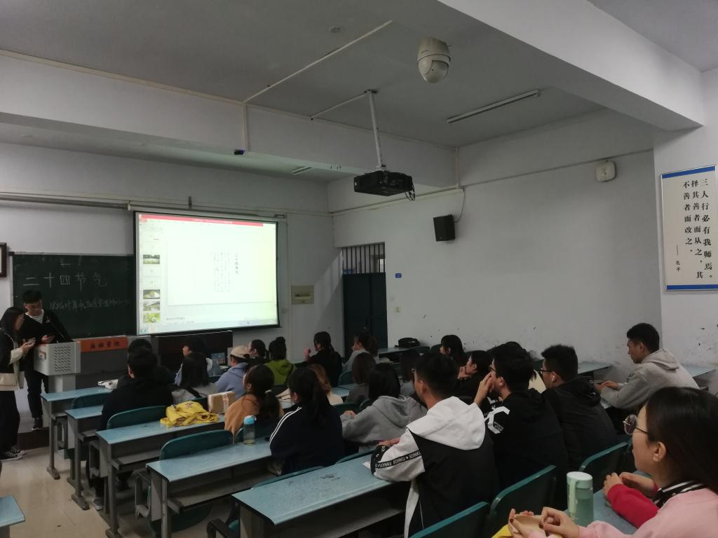 活动开始,由团支书王梓钰同学通过提问的方式进行同学关于二十四节气的知识调查,在提问过程中同学们争先恐后的举手抢答。随后通过PPT讲解对同学了解的关于二十四节气知识加以补充,在提到二十四节气歌后同学们大合唱般的背诵出二十四节气歌,紧接着引入“节气之春,文化之根”的深入含义,使同学了解到二十四节气是中华文化的智慧结晶以及二十四节气在中华文化乃至世界范围内的重要地位。在最后,以同学们最熟悉的二十四节气歌结束。