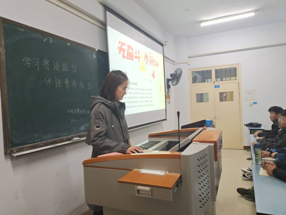 为深入学习习近平总书记五四寄语精神,学习习近平总书记致全国各个青联、学联会议贺信传达的精神,20级计算机类3班于12月1日下午4点整齐聚A14-127教室成功举办了“学习寄语回信·体悟青年担当”团日活动。此次活动由团支部书记董俊菲主持。