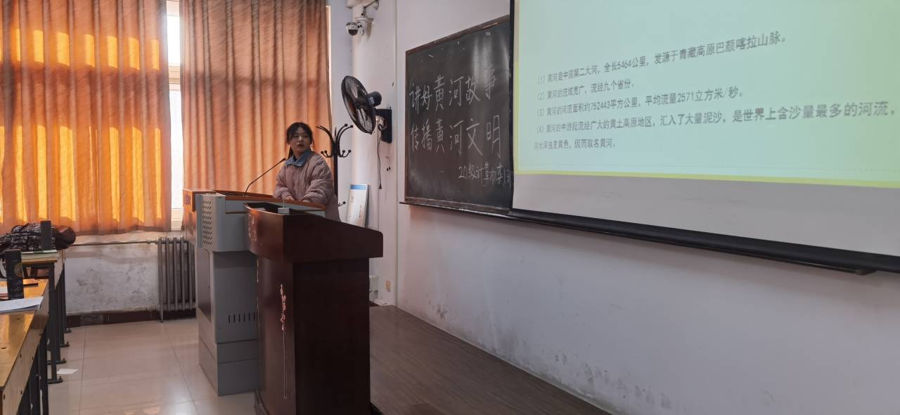 活动伊始,马柳柳同学以传承、保护、弘扬黄河文化为切入点,用自己独特的视角,向同学们讲述了“黄河故事”的主题内容。随后,团支书马柳柳为同学们播放了“黄河故事”的相关视频,视频中通过历史的再现、数据的引用,对黄河流域的人物故事、文化艺术以及黄河文明追本溯源。通过观看视频,同学们感慨于黄河的波澜壮阔,也对劳动人民治理水患过程中表现出来的大无畏精神表示由衷的钦佩。紧接着,员工代表胡耀阳同学上台进行发言,他表示深刻地认识到了黄河文化是中华文明的重要组成部分,是中华民族的根和魂。最后,团支书马柳柳对此次团日活动进行总结,并要求同学们要延续历史文脉,坚定文化自信,为实现中华民族伟大复兴的中国梦凝聚精神力量。