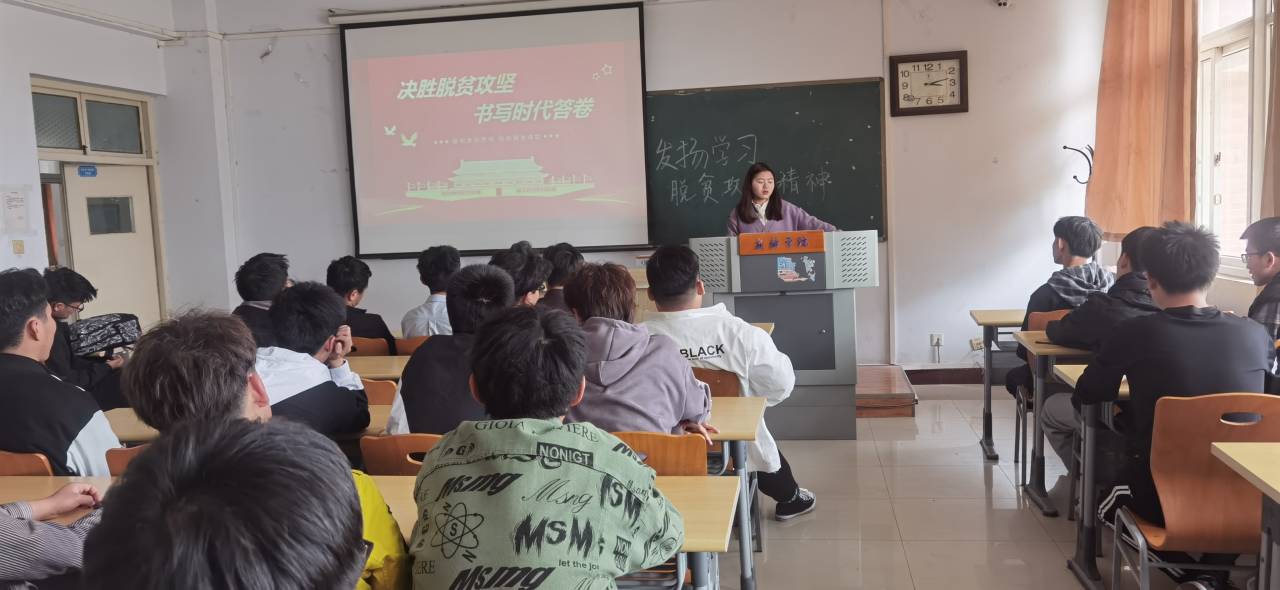 活动伊始,团支书马柳柳通过PPT展示阐述了习近平总书记在全国脱贫攻坚总结表彰大会上的重要讲话精神和脱贫攻坚历程,讲述了精准扶贫典型样板以及在脱贫攻坚道路上获得的累累硕果。随后,组织委员讲述了全国脱贫攻坚楷模获得者工作事迹,胡耀阳、梅志豪作为员工代表也积极分享了脱贫攻坚政策实施以来自己家乡的巨大变化以及自身的深切感悟。从他们的发言中同学们真实地感受到党中央“全心全意为人民服务”的宗旨。最后,团支书马柳柳上台对此次团日活动进行总结,并要求同学们要以习近平总书记重要讲话精神为统领,发扬脱贫攻坚精神,在“十四五”开局之际以更饱满的热情投入专业学习,增强本领才干,努力成为祖国的优秀人才。