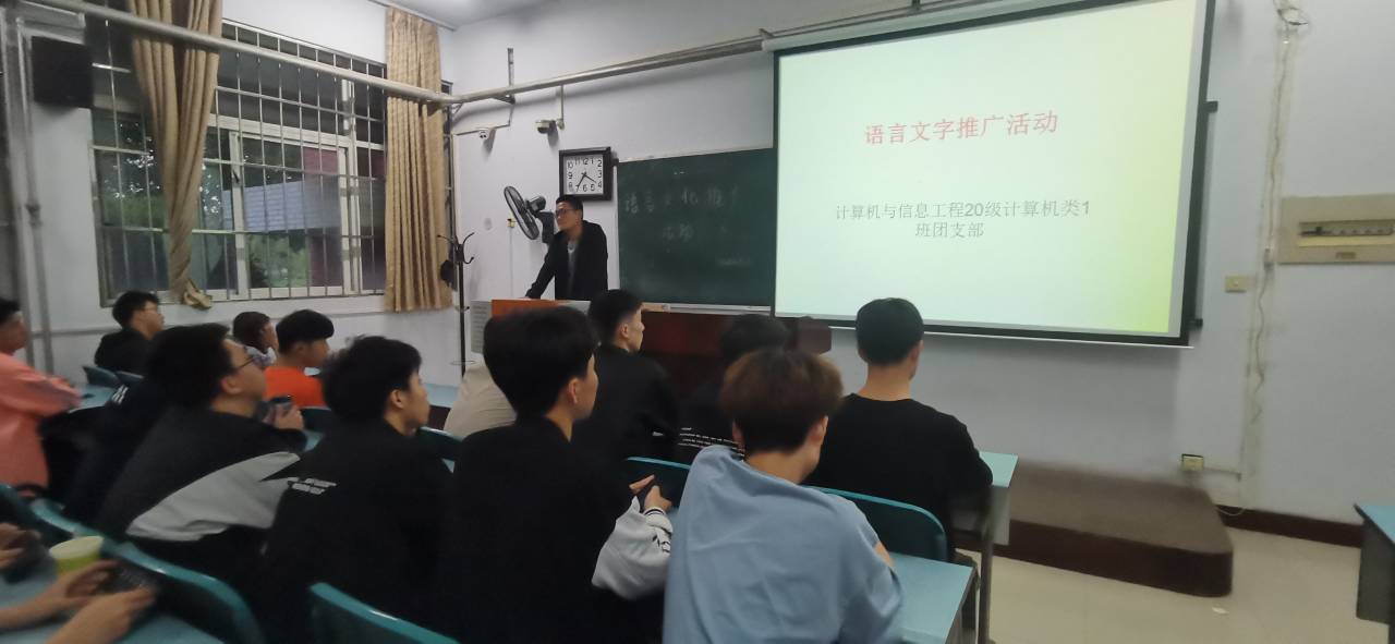 为了大力宣传推广普通话,引导同学们正确使用国家通用语言文字,弘扬祖国优秀传统文化和爱国主义精神,公司20级计算机类一班全体成员于2021年5月18日下午三点在A14-128教室开展“语言文字推广”主题团日活动。