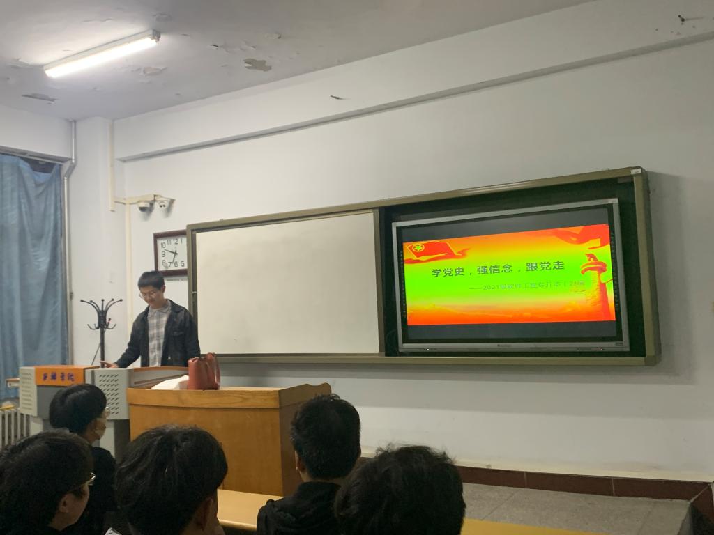 此次团日活动由团支书程大帅进行主持,活动伊始,团支书程大帅带领同学们观看“学党史,强信念,跟党走”PPT,同学们认真地听党史,学习党史,理解党百年奋斗的光辉历程。随后,团支书程大帅让同学们在班会中分享自己印象最深刻的党史。同学们积极地参与到这个环节中,向其他同学讲述自己印象最深刻的党史,分享自己的体会和感悟。紧接着,宋伟涛同学作为员工代表发言,表示学习党史是为了更好地践行新时代党的使命与担当。团日活动最后,团支书程大帅对此次团日活动进行总结,并鼓舞同学们铭记先辈奋斗历程,传承革命精神,坚守奋斗初心,牢记发展使命,立足岗位,强化责任与担当,以实际行动践行红色精神。