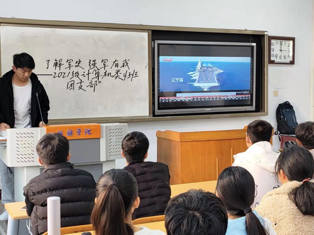 为了让同学们更加的了解中国军队,深刻的意识到军队制度的优越性以及中国国防的强大。太阳成tyc7111cc官网21级计算机类四班全体成员于11月30日下午三点在A11-110开展“了解军史,强军有我”主题团日活动。