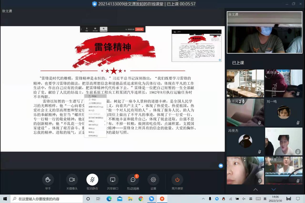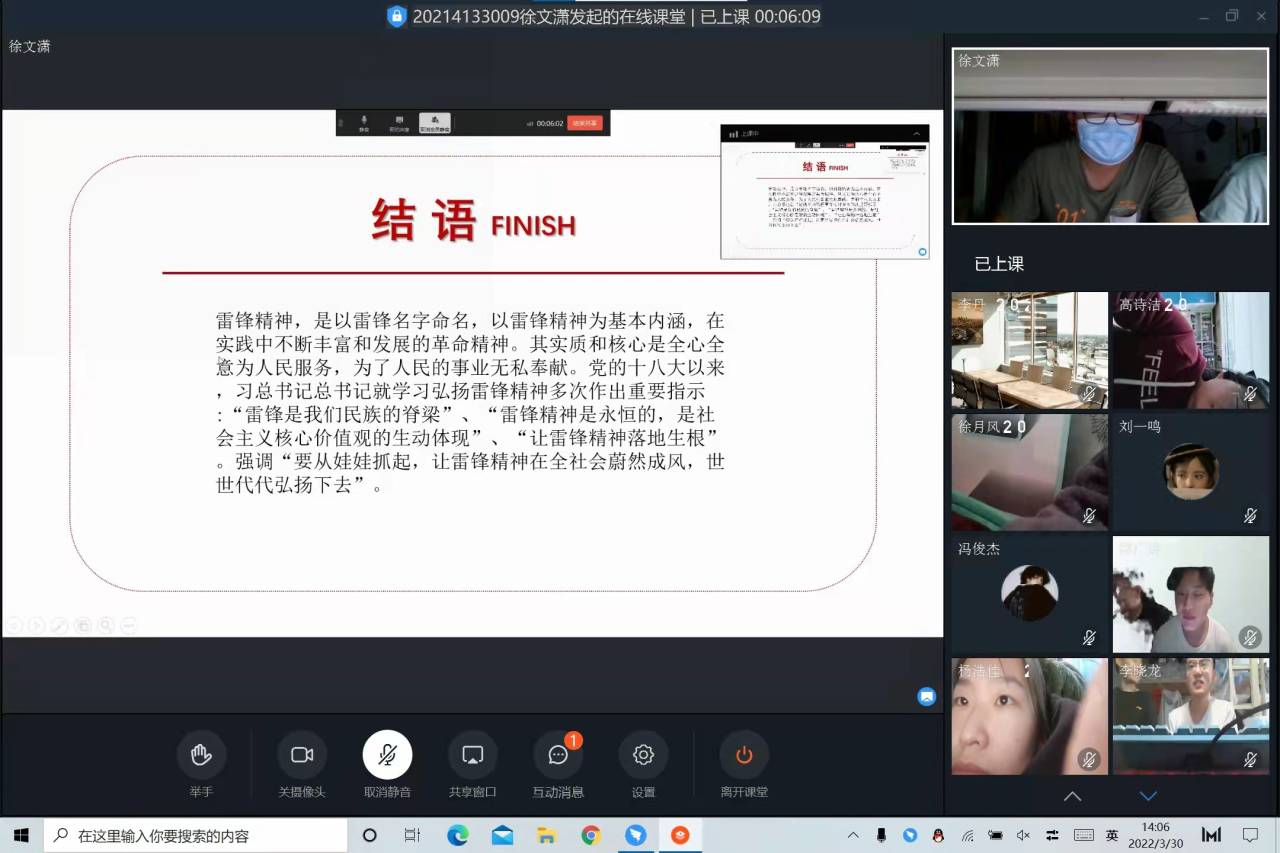 为进一步弘扬新时代雷锋精神,以习近平新时代中国特色社会主义思想和党的十九大精神为指引,弘扬社会正气。太阳成tyc7111cc官网21级物联网工程1班(专升本)全体成员于3月30日下午两点在线上开展“弘扬雷锋精神,创建文明校园”主题团日活动。