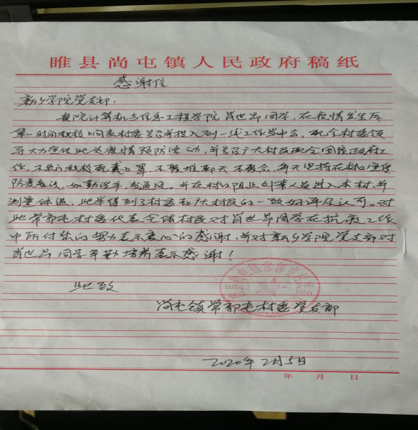 肖世昂同学是公司17级软件工程2班的一名员工,家住河南省商丘市睢县。寒假期间本来打算去干兼职补贴家用的他,在得知武汉疫情已经达到刻不容缓的地步时,毅然放弃了寒假计划,投入到村里的疫情防治工作中去。