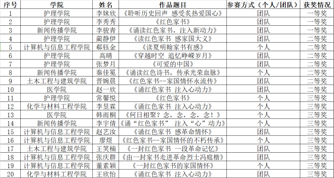 此次活动以线上作品收集的方式进行。活动进行过程中,参与者们以个人或团队的形式参赛。红色家书是历史的见证,是革命精神的传承。同学们通过一封封具有代表性的红色家书,走进主人公的世界,共同找寻和感悟共产党人的初心坚守与赓续传承。每一封家书,都饱含着深厚的家国情怀,承载着中华民族独有的民族内涵。在视频中,同学们通过朗诵一封封家书,与先烈们对话,感受先烈们在烽火连天的峥嵘岁月里绝不屈服的坚强和对亲人的思念付诸笔墨的隐忍,为他们那真挚的至爱亲情、炙热的家国情怀、坚定的革命信念以及“俯首甘为孺子牛”的革命奉献精神而动容。