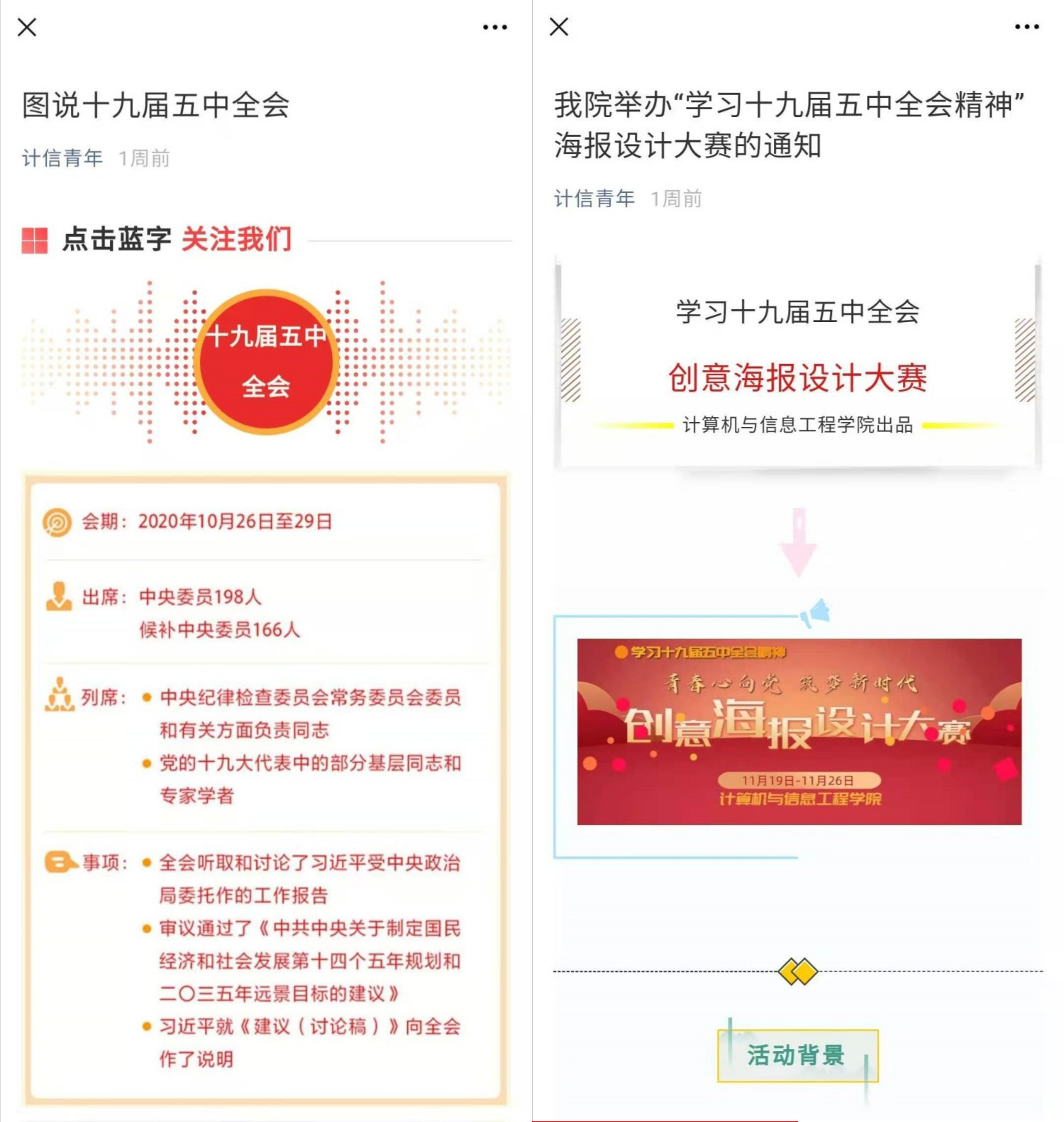 公司各党支部利用学习机会,通过分组学习、个人自学、交流发言等方式,不断加深对全会精神的理解和把握。各级党、团干部率先学习,以上率下带动学习氛围,认真领会五中全会主要内容和精神实质;同时,公司团委结合专业特色,以员工喜闻乐见的方式开展学习,组织各团支部积极开展学习十九届五中全会“青春心向党·筑梦新时代”海报设计大赛,增强学习效果。同学们积极参与,认真学习,共收到电子、纸质海报共计80余份,通过作品评比、展示,扩大宣传效果,使十九届五中全会精神入脑入心。各团支部通过团日活动,开多种形式开展学习活动,如演讲、朗诵、微团课等,并要求学员做好相应记录、撰写学习心得,推动学习全会精神往深里走,往心里走。