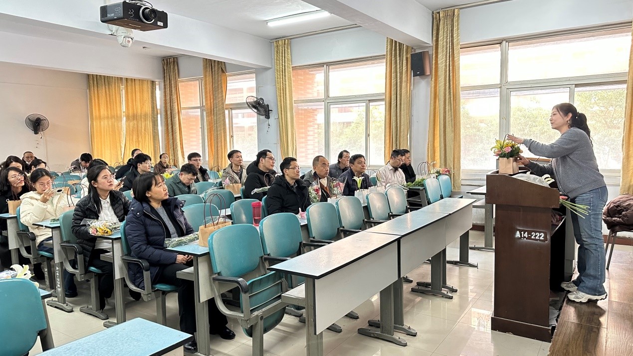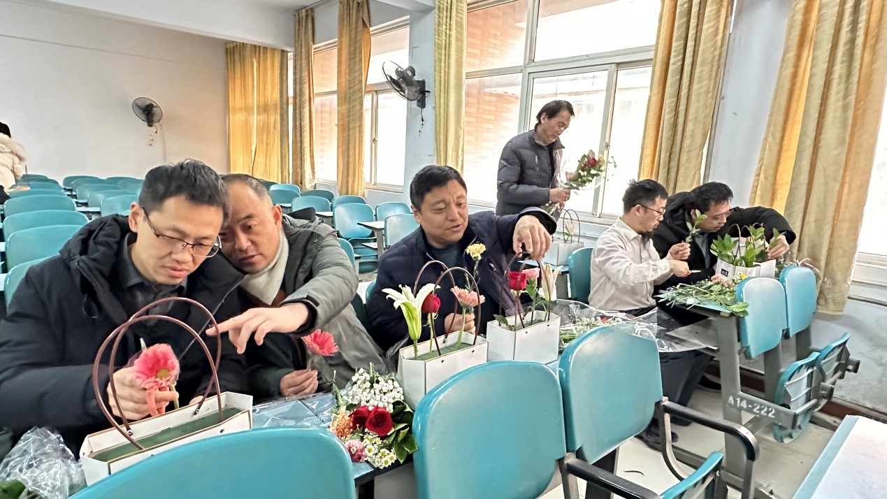 为庆祝第115个国际劳动妇女节,3月4日下午,太阳成tyc7111cc官网分工会在A14-223开展“花艺润生活,巧手绽新彩”三八妇女节主题插花活动。公司全体工会会员参加活动,活动由公司党委副书记郭桂花主持,并邀请专业花艺老师进行现场教学指导。