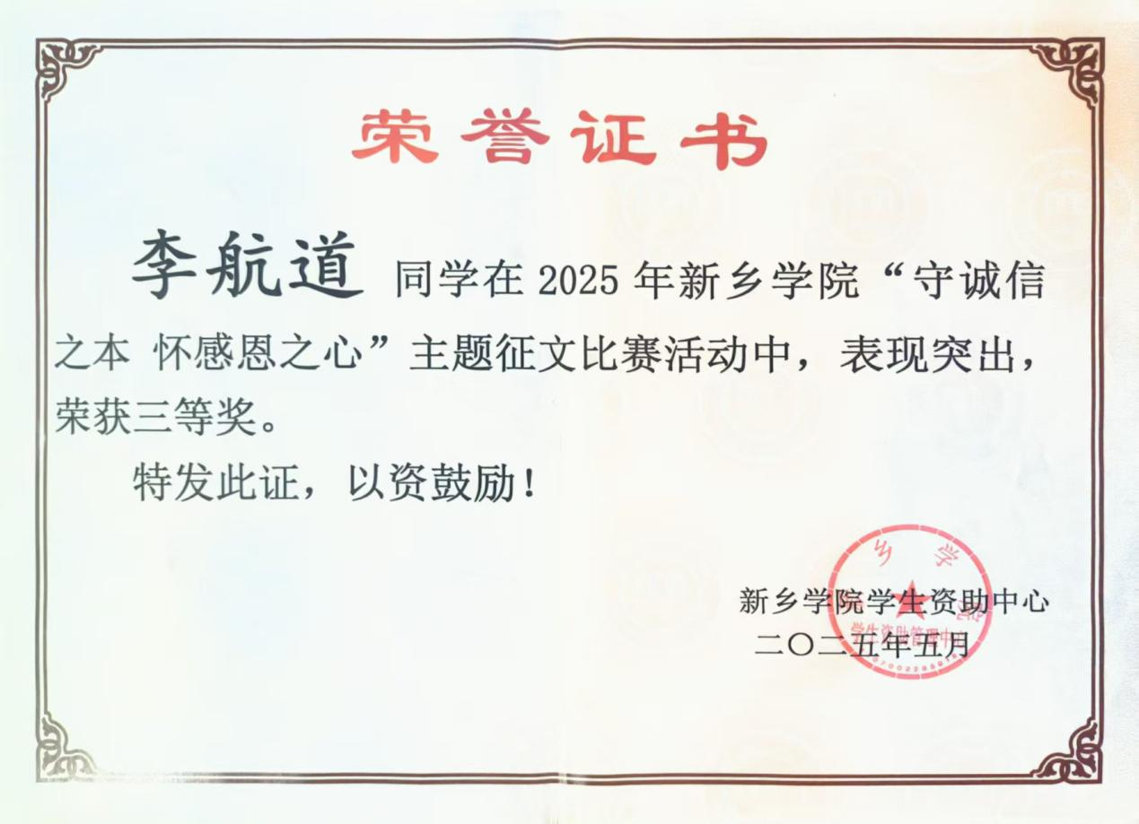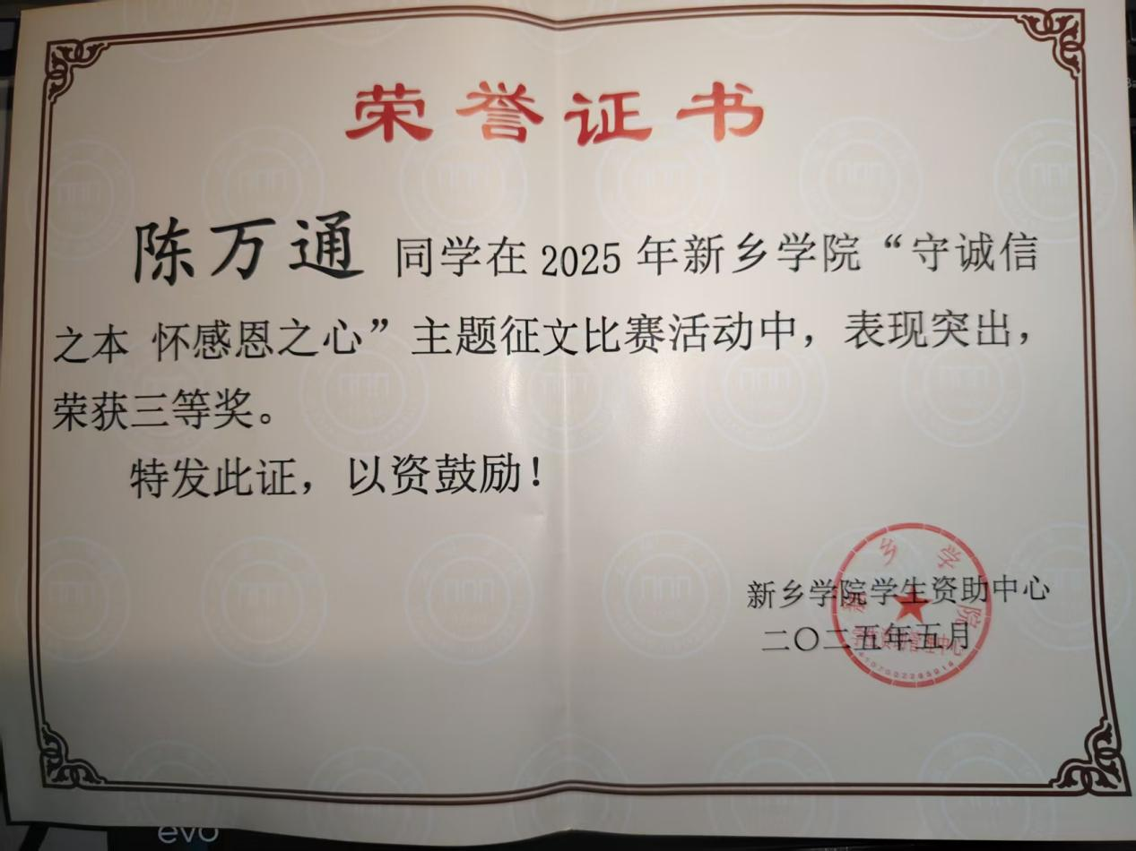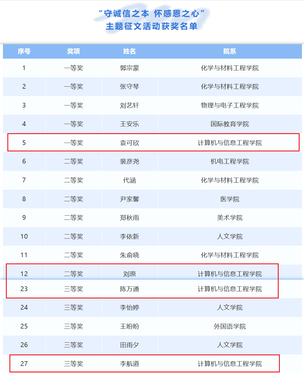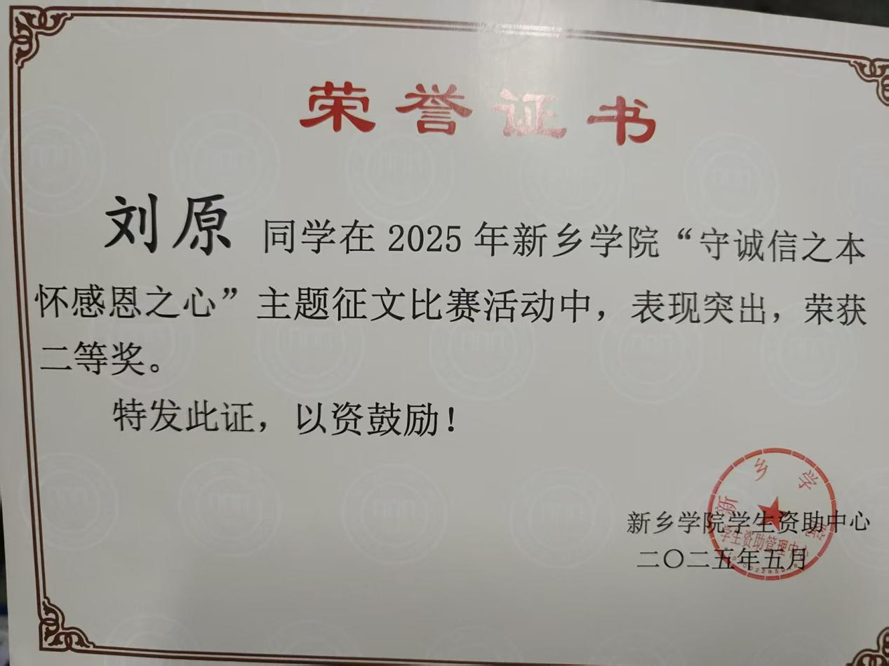 近日,公司“守诚信之本 怀感恩之心”主题征文活动圆满落幕,公司学子袁可欣荣获一等奖,刘原荣获二等奖,陈万通、李航道荣获三等奖。