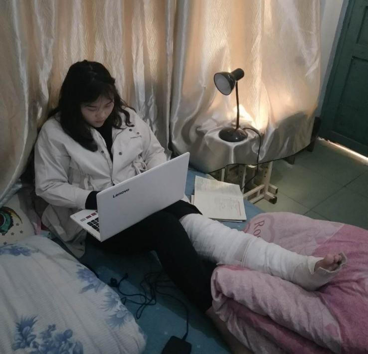 3月4日,侯以敏同学因意外扭伤,致左腿半月板二级撕裂,髌骨骨折及左脚踝骨裂,左腿全腿石膏,只能静卧在床,但她并没有因此而灰心丧气,休养几天之后,她便打起精神,更加努力学习,坐着使用电脑时间久了,左腿疼痛难忍,她便躺下来换手机继续学习;在得知团总支工作任务较多时,她主动联系老师,申请复工,忍着身体的疼痛和不便,协助老师和其他干部做好相关工作,全身心投入到工作和学习中。
